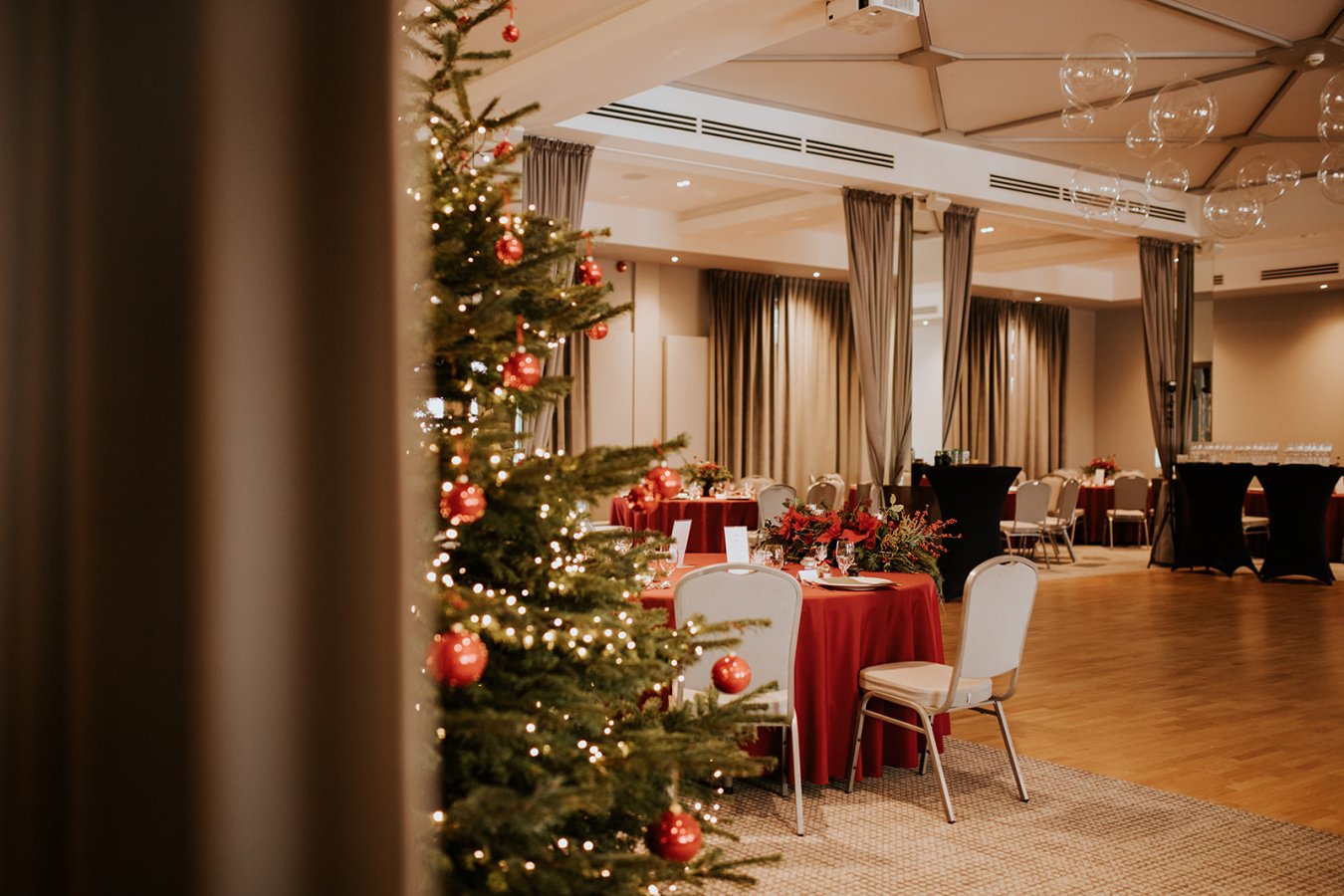 Warto postawić na światło – nie tylko klasyczne oświetlenie sali, lecz także lampiony, oświetlenie punktowe czy dekoracyjne żyrandole. W miejscu takim jak Hotel Sezony naturalny blask wpadający przez świetlik oraz lustra otaczające parkiet tworzą efekt przestrzeni pełnej światła i elegancji. Zimą jest to szczególnie cenne, bo dzień trwa krótko i dobrze zaplanowana gra światłem decyduje o nastroju całego wydarzenia.